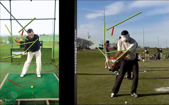 L’immagine qui sotto, che mette a confronto il mio swing di qualche settimana fa (ovvero appunto di quando il problema mi è stato chiarissimo) con quello, si parva licet, di Sean Foley, e che è ricavato dalla videolezione di cui avevo parlato qui, illustra molto bene il concetto: