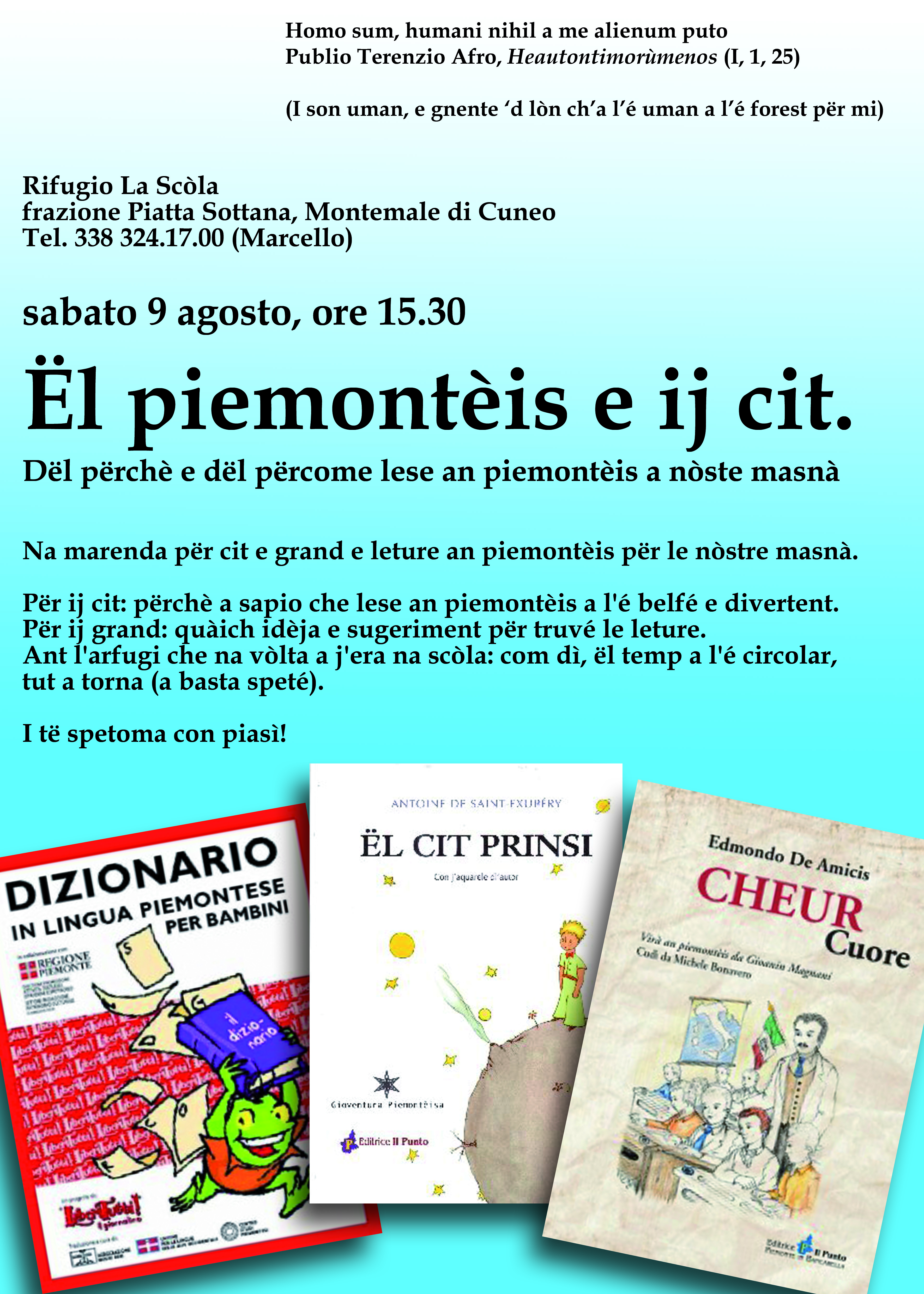 Parlé an piemontèis a l’é già un pòch pì malfé. Nen con papà e mama, e gnanca con ij parent, e pì an general con tute cole përson-e ch’i identìfich come piemontèise (parleje a mama an italian a l’avrìa gnun sens, tant për dì). Ma con mie cite, bin, a l’é un pòch pì complicà. I tend a mës-ce le doe lenghe, ròba ch’am pias nen ma a càpita, i deuv fé në sfòrs cossient – lòn che an prinsipi am capitava nen – për seguité con ël piemontèis. A l’é nen ch’a sia na bataja persa, nò; a l’é mach che jë sfòrs sensa arzultà ciàir a ciamo tanta aplicassion.