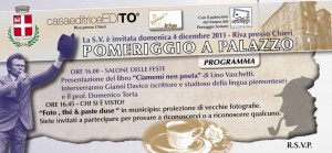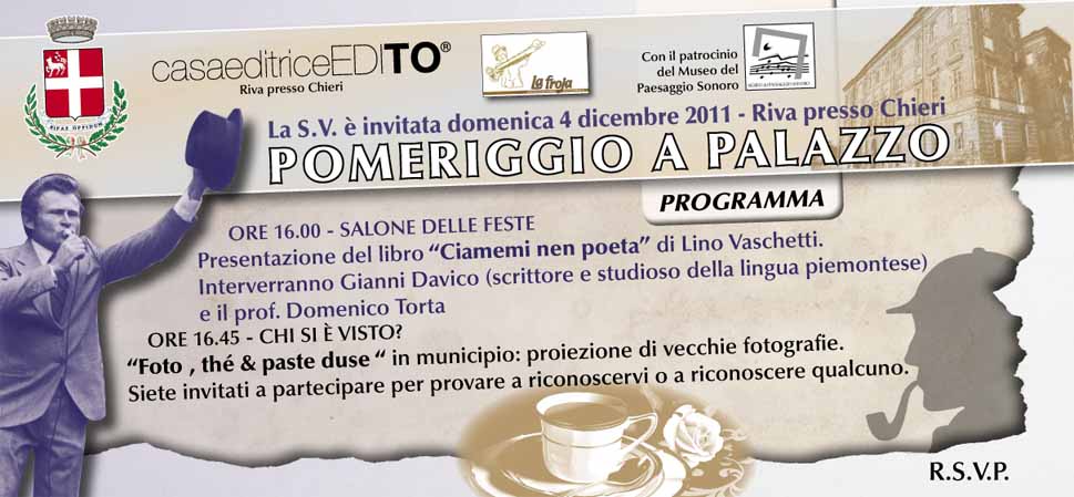 Vaschetti ant ël chierèis a l’é conossù dzora ‘d tut për sò stranòt. Stranòt che adess a son diventà lìber: Ciamemi non poeta (edission EDITO, 2011, pp. 88, EUR 13). Ël volum, che as treuva a la librerìa della Torre (via Vitòrio Emanuel 34 a Cher) e a l’edìcola d’Andzen, a sarà presentà costa domìnica – 4 dzèmber – a quatr’ore ant ël salon dle feste ‘d Palazzo Grosso a Riva ‘d Cher. Mi i-i sarai e i dirai doe paròle: mé letor a son tuti invità.